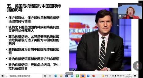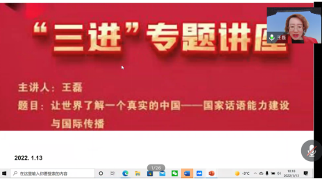 为加强同学们对讲好中国故事的理解,1月13日上午,js3333线路检测中心举办“三进”系列讲座活动,邀请北京第二外国语学院王磊教授作“让世界了解一个真实的中国——国家话语能力建设与国际传播”线上主题讲座,师范系主任谢剑萍,师范系教师杨芳以及部分学生参加此次活动。