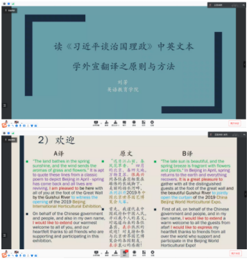 刘芳博士介绍,本学期翻译课程组将依照大学关于“三进”专项工作的部署,筹划多次面向线路检测中心教育系和师范系学生的“三进”主题翻译培训与讲座,其中包“隐喻翻译与《习近平谈治国理政》英译本赏析”(江玉、杨义豪),“时政翻译与《习近平谈治国理政》英译本赏析”(赵红辉、徐翠华),“习语翻译与《习近平谈治国理政》英译本赏析”(李欣芳、黄艺)以及“英汉对比与《习近平谈治国理政》英译本赏析”(李静、秦勉)。