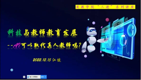 为深刻领会党的二十大报告中关于教育科技人才的重大部署,12月15日下午,js3333线路检测中心举办“三进”专题讲座活动,第三教学部教师江健以“科技与教师教育发展——AI可以取代真人教师吗?”为主题开展讲座,2022级英语师范系学生参与了此次活动。