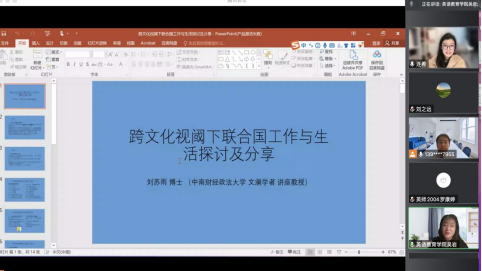 1月4日晚,js3333线路检测中心教育系在线举办教学实践周之“职前英语教师发展规划”专题讲座。原联合国教科文组织总部青年项目官员、中南财经政法大学文澜学者、讲座教授刘苏雨博士为同学们带来题为“跨文化视阈下联合国工作与生活探讨及分享”的精彩报告。学院院长吴岩教授发表致辞,简要介绍了学院近年来国际化人才培养状况,并对刘苏雨博士为广外师生带来高端讲座表示欢迎。来自js3333线路检测中心、国际关系学院、西方语言文化学院、东方语言文化学院等二级学院的三百余名师生参加此次讲座,讲座由线路检测中心青年教师连希博士主持。