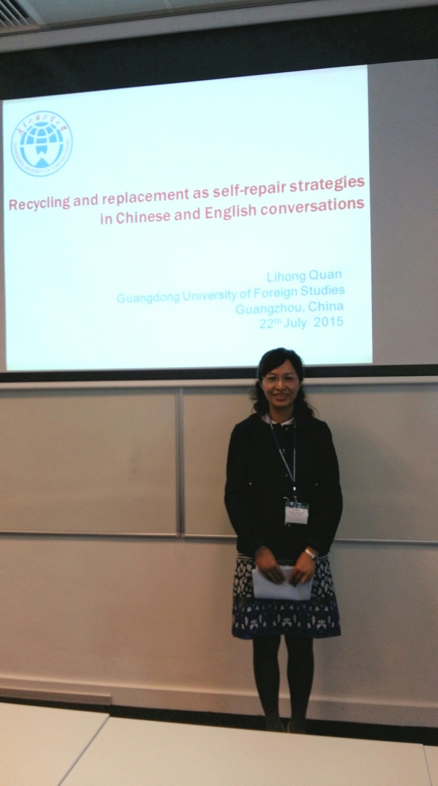 在分组会议上,权立宏教授作了题为“Recycling and replacement as self-repairstrategies in Chinese and English conversations"的发言。该研究基于英语口语语料库和权立宏及课题组新建设的汉语口语语料库,从汉英语序、句法投射性和句子成分复杂度等作为概念分析框架,探讨了汉英本族者在会话自我修补使用上的异同。该发言得到国内外学者的关注及热烈讨论。参会期间,权立宏与各国学者进行了广泛的交流;与比利时鲁汶大学的Sylviane Granger教授交流与分享了使用学习者语料库的经验和体会;并与北京外国大学语料库语言学团队的老师就基于自然语境下的汉语本族语者口语语料库合作开发达成了初步意向。