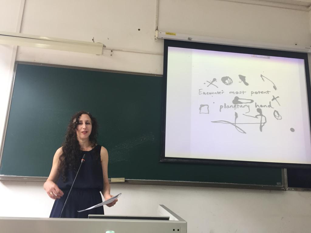 尽管雷妮在美国诗歌界已享有很高的知名度,中国读者对她所知甚少。在讲座的开始,雷妮介绍了自己和她的诗歌。从她9岁的第一首全部押韵的诗歌到今天的每一首都力图与前一首不同的诗歌,雷妮的诗歌是一个不断创新、打破常规、探索新的可能性的过程。每一首诗歌在创作之前是一个未知数,诗人不仅在语言中营造新的时空,更将语言当作空间,不断地组合、扩张,实现语言的无限潜力。比如,她常常以一首现成的诗歌为材料,将其中的语言重现组合,在形式和内容上进行突破。或者从传统的诗歌体裁出发,拆缩整合,组织出新的形式,仿佛母体上发出的新枝,形态各异又相互联系。