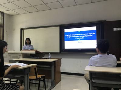 大会邀请了TESOL Quarterly 联合主编及美国密西根州立大学教授Peter De Costa 、英国华威大学教授Tony Liddicoat、加州州立大学圣伯纳迪诺分校教授陈融、中国社会语言学学会前会长及北京大学教授高一虹等著名学者作主旨发言。线路检测中心刘会英教授、李欣芳博士分别在机构语境中元语用语言研究和实验语用学这两个专题分会场作了题为 “语用学研究的文化哲学视角审视”、 “Pragmatic compensation for non-on-topic talk by right-hemisphere-damaged patients”的研究报告,并与其他参会学者进行了深入讨论和交流。下图为线路检测中心教师在分会场发言。