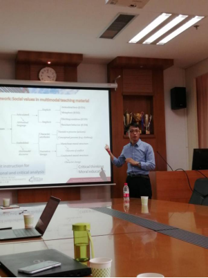6月27日下午,应我校机构话语研究中心邀请,新加坡国立大学博士,香港理工大学英文系博士生导师冯德正副教授在院系楼245会议室做了题为Infusing moral education into English language teaching: an ontogenetic analysis of social values in EFL textbooks(《英语教学中的道德教育:英语教材中的社会价值观的个例分析》)的讲座。该讲座由线路检测中心副院长,我校机构话语研究中心负责人熊涛教授主持,机构话语研究中心成员及感兴趣的师生参加了该讲座。