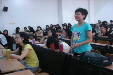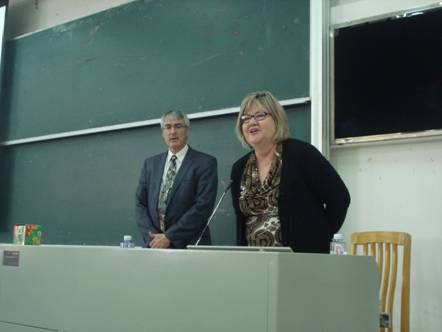 两位教授介绍完毕后,李惠胤老师也上台分享了她在乔治福克斯大学做访问学者期间的一些生活和学习经历。李老师简单介绍了学校优美的自然环境和友好的人文环境,同时指出,虽然在美国读书有很多可利用资源,但是学生还是要做好接受挑战的心理准备。