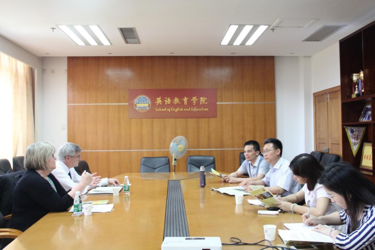 之后,Carol Brazo教授详细介绍了乔治福克斯大学为参与该项目的学生设计的两年学习计划,包括学生每年需要修读的学时、学分,和课程内容。学院领导认真聆听了两位教授的讲解和介绍,并提出了一些问题,两位教授耐心回答。接下来,双方就合作协议书中的一些条款进行了商讨,主要包括每年可加入项目的学生名额数,以及乔治福克斯大学可提供的奖学金和研究经费情况。