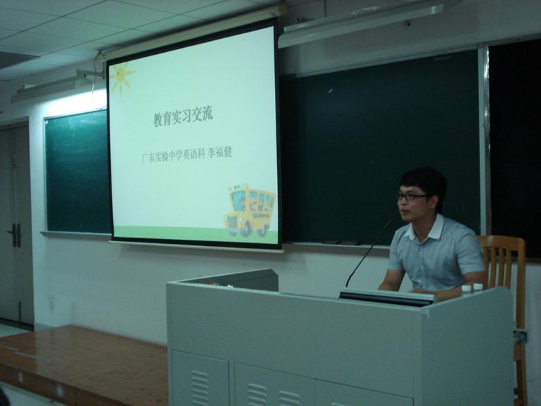 李福健首先作经验分享。作为广东实验中学高中部的一名英语教师,李老师表达了对母校的感谢后,针对教育实习中的教学工作实习做了经验交流。教学工作实习包括听课(观摩)、上课和批改作业与辅导。听课的环节作为教师要知道听课到底有多重要?该听那些课?如何听课?怎样听课或者要怎么去观摩一节课?这些教师要根据课型、教学目标的达成与否去决定,李老师同时也建议可以通过创设多样情景、调节学习活动难度、多样化评价方式和及时反馈调控来指导与调控课堂活动和调节课堂气氛提高学生参与度。上课的过程中,要自己定位好自己的教学类型,无论是一个演员型还是一个专家型,都要明确自己的教学目标。教师可以营造氛围,拉近学生距离,通过营造课堂亮点,将课堂教学推向高潮。另外教师更应该懂得随机应变,善于巧妙地在学生不知不觉中作出相应的变动才是真正的好老师。