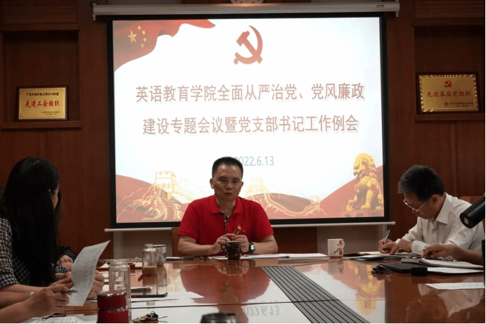 林绍雄解读了学校党委2022年全面从严治党工作要点及其有关要求,对学院2022年落实全面从严治党工作进行了部署,明确了学院党委落实全面从严治党主体责任清单。林绍雄强调,做好2022年全面从严治党工作,各级领导干部要强化主体责任,守住根本任务,落实制度要求,以高度的政治责任感和政治敏锐性,认真落实全面从严治党和廉政建设工作各项要求,将工作做到前面,将全面从严治党同加快高水平英语师范学院建设、提高人才培养质量结合起来,同落实党对学院工作的全面领导、加强党的基层组织建设结合起来,结合各部门、各支部的具体实际,将全面从严治党落在实处、做出实效、创出特色。