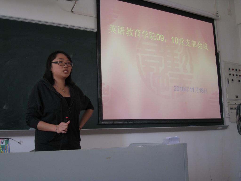 首先,党支部副书记何鸣彦同志简单介绍了新成立的09、10党支部的基本情况。其中包括对支部的书记、副书记、纪检委员、组织委员等人员的介绍和本支部所涵盖的党员、预备党员和各期入党积极分子的人员构成等信息,让与会者对这个新成立的党支部有了更进一步的了解。