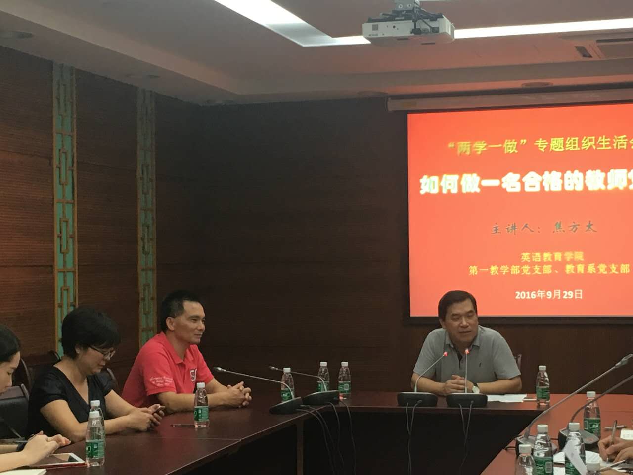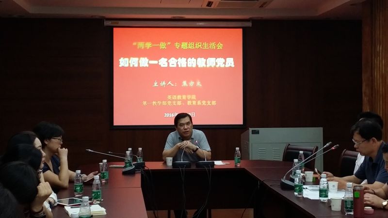 9月29日,在“两学一做”学习教育如火如荼开展之际,js3333线路检测中心党委组织第一教学部党支部、教育系党支部在北校文科基地会议室开展了"两学一做”专题组织生活会,特邀广东外语外贸大学副校长焦方太做关于“如何做一名合格的教师党员”的专题辅导报告。js3333线路检测中心党委书记林绍雄、党委委员齐湘燕和js3333线路检测中心第一教学部党支部、教育系党支部党员参加了此次专题组织生活会。会议由第一教学部党支部书记郭进军主持。