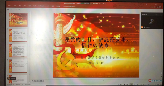 2020年7月9号下午2点至3点半,js3333线路检测中心第一教学部党支部共聚云端,借助腾讯会议为媒介举办了主题为“迎党的生日、讲战疫故事、悟初心使命”的支部组织生活分享交流会。会议旨在欢庆党的第九十九个生日,并借机邀请支部各党员分享身边感人的战疫故事,从而推动大家从思想理论高度重新感悟作为党员的初心和使命。