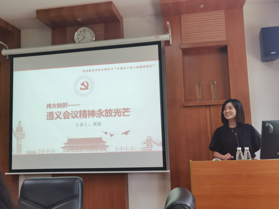 周喆回顾了遵义会议时期的重要历史事件,着重讲解了遵义会议的召开情况、会议成果和历史意义。她表示,遵义会议是我们党的历史上一个生死攸关的转折点,在马克思主义中国化、走独立自主发展道路、坚定正确路线和党的领导集体等方面,留下了宝贵经验和重要启示。遵义会议的精神内涵体现在“坚定信念、实事求是、独立自主、民主团结”四个方面。周喆结合“村支书黄大发36年修天渠”、“脱贫攻坚的‘贵州战法’”、“民主集中制基本原则”等案例分析,揭示了遵义会议精神的时代价值,倡导大家在新时代运用好遵义会议历史经验,坚定信念、为人民谋幸福,实事求是、因地制宜解难题,发扬民主团结、坚定独立自主,开启全面建设社会主义现代化国家的新征程。