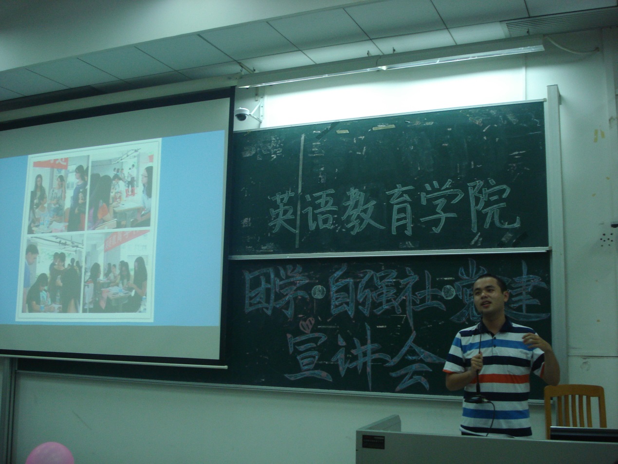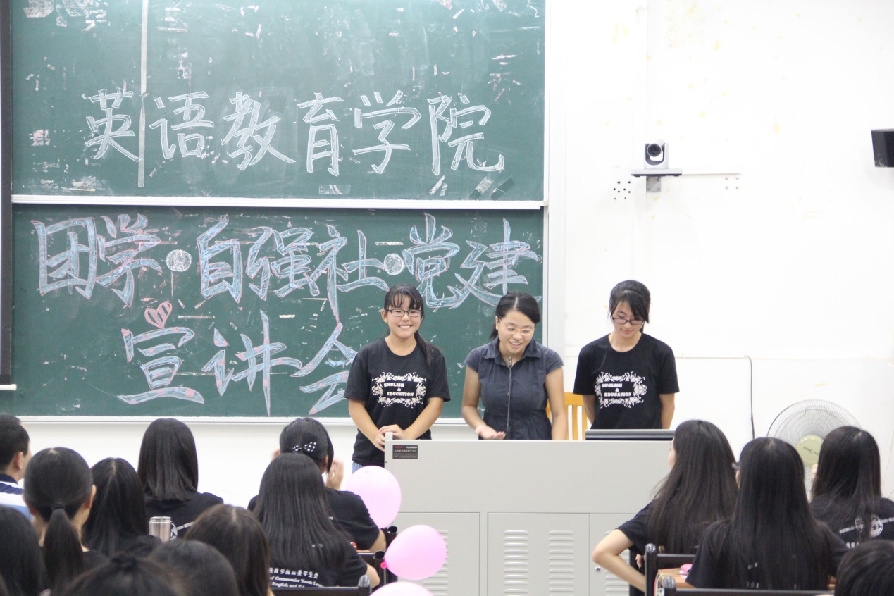 大会甫始,主持人赖钰盈宣布宣讲会开始,并简单地介绍了英教团学的组织结构及本次宣讲会的主要流程。此次宣讲会流程有三,分别为:新任团委书记林泽龙上台讲话;团学各部门部长上台进行部门介绍;自强社各部长及党建代表进行部门介绍。