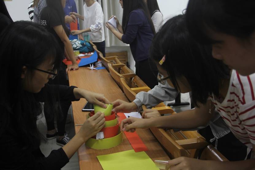接下来,大会进行到了破冰游戏环节。游戏主题为“心中的塔”,在场同学抽签进入十个小组,各小组需要在规定时间内用卡纸等材料制作一个塔,并派代表上台展示。所制作的塔应体现凝聚,创新的英教形象。各小组迅速展开了激烈的讨论,每个同学都参与其中,献计献策。随后,同学们分工合作,各司其职,
