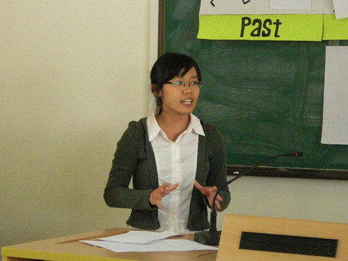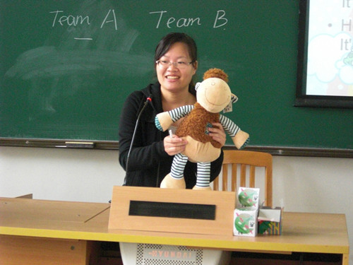 “Teaching for a life”,为了演绎这一理念,参赛选手们各出奇招。胡伟娜同学带来了一堂关于天气变化的课,可爱的毛公仔Ben作为课堂用具吸引了学生的目光,欢快的歌声寓乐于学习中,活泼的肢体动作加深了学生的记忆。这边的课堂还没下课,那边的高小燕小老师就开始上起充满温情的感恩课了。在贴好精心准备的图画卡纸后,充满激情的她问道:“Do you remember your birthday? And do you remember your mother’s birthday?”她用生动的图画展示了一位母亲的生命历程,将知识与亲情相结合,不仅让学生掌握了现在完成时的语法,也教会了他们学会感恩。王佳同学用心构建起自己的微笑课堂——“some expression about smile”,真诚的笑容打动了评委,与学生积极互动的游戏也获得了好评。“Teaching for a life”不仅指在教学中展现生活,感受生活,还寓意在教学中提升生活。周炫同学用一口流利的英语讲解怎样包饺子,以英语为载体传递了我国的传统文化;陈静仪同学则选题“The art of speaking”,介绍礼貌的说话用语与方式,突出要兼具说话礼仪与宽容心态的主题。