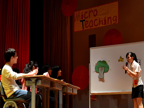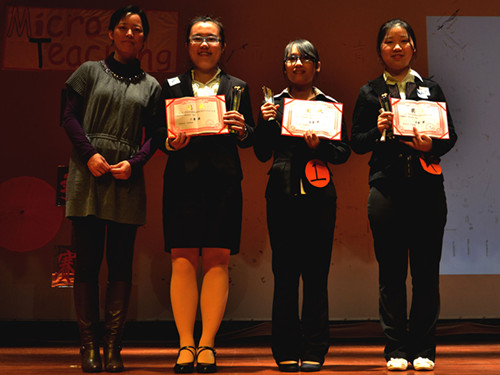 第一位上场的选手黎日娥以“About Chrismas”为主题,利用图片、游戏与学生进行互动,让学生在反复的操练中掌握新句型、新单词。身着短袖上装的二号选手潘英冰一登场,便以可爱的热身操引燃全场气氛。warm-up过后,她那制作精美、色彩丰富的水果教具牢牢抓紧了台上乃至台下的所有眼球。三号选手陈文亮来自政管学院,她善用自己的图片与学生拉近距离,并且巧妙地运用选举和讨论的形式阐述“A friendly person”,流利的口语、自信的台风,使她展现出丝毫不逊于英教学子的风采。四号选手王佳紧扣“smile”这一温暖的主题,借助可爱的图片和学生表演来描述smile,摆脱了传统死板的教学,让课堂变得趣味盎然。而五号选手董沛文走的则是活泼路线,她利用身边的实际事例与真正的初中课本,为在场的所有人员带来了一场别出生面的听力课,赢来观众阵阵掌声。最后登场的六号选手朱昱诚选择的则是高中二年级关于卓别林的阅读课文,他的成熟老练一扫平时阅读课的枯燥与乏味,开场的两个著名谐星的视频——赵本山和小沈阳的春晚小品《不差钱》以及卓别林的《摩登时代》逗趣片段在极短的时间内调动起学生的浓浓兴趣。