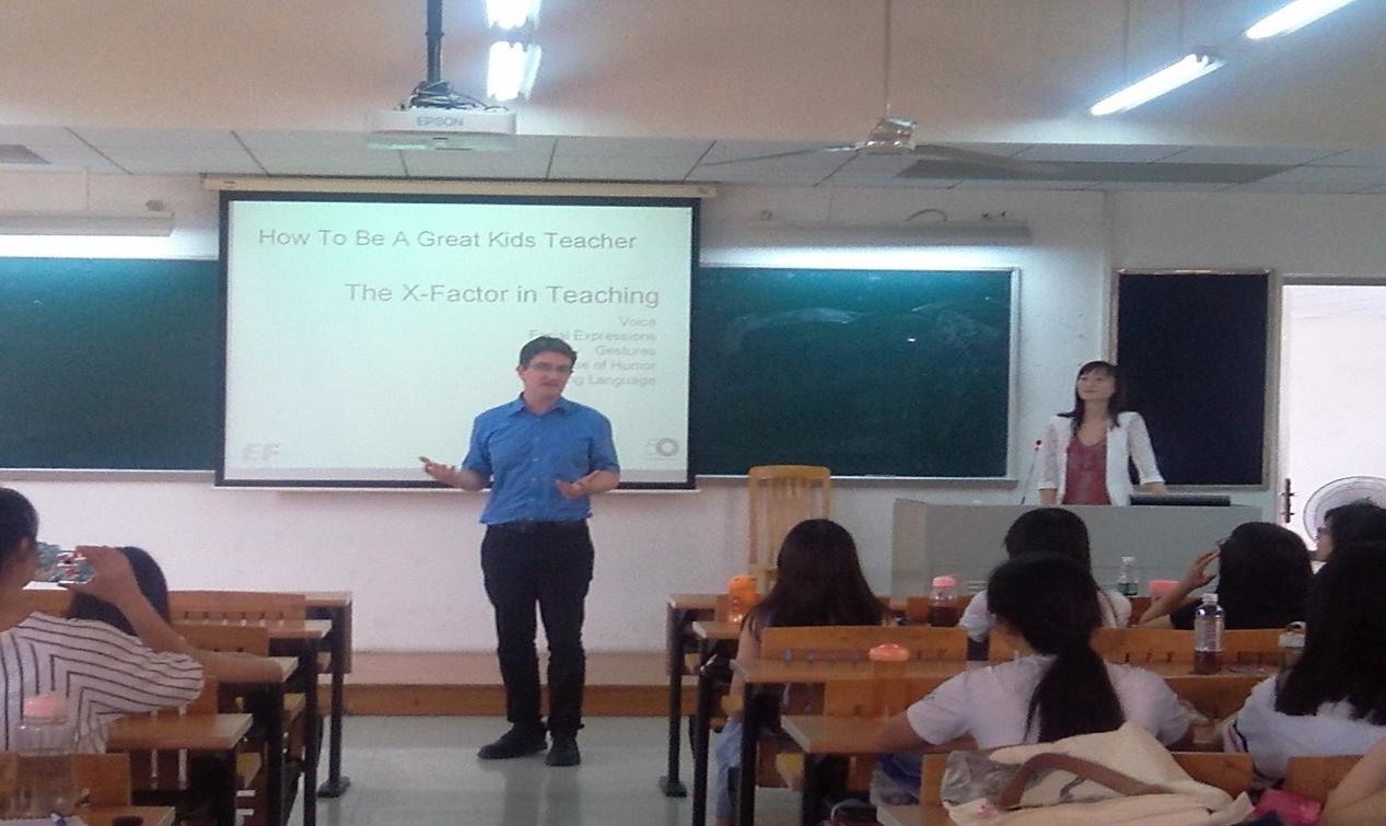 9月10日上午南校区教学楼F309,英孚教育戚娇莹、Steven Hogan以及余颖昕为线路检测中心2012级教育系学生作了实习教育讲座。该讲座由教育系主任谢剑萍主持,副院长熊涛出席了此次讲座。