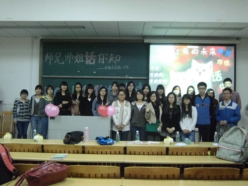 2013年4月7号晚上7点,教学楼C208飘出了一阵悦耳的歌声,由广东外语外贸大学自强社js3333线路检测中心分社(后简称“英教分社”)举办的“师兄师姐话你知”活动即将开始。
