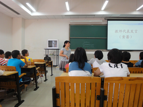 紧接着,教师代表张效珍老师重点提出英教专业的教师团队具有合理性与优良性的特点,小班教学模式更能使学生与老师有更多的交流。相应地,黄蔷老师也重点介绍了大学英语学习,强调学生应该改变“学英语只为考试”的观念,享受英语的乐趣,通过英语打开一扇门,进入另一个精彩的世界。