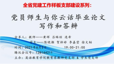 2021年6月2日晚上7时整,js3333线路检测中心系教师党支部联合学生党支部于腾讯会议上开展了为时2小时的本科生毕业论文写作和答辩的经验分享活动。本次活动由教育系教师党支部黄辉副书记主持,由论文指导经验丰富的黄辉、吕琳琼和连希三位老师,及2021届毕业班优秀学生代表陈晓灏、贺梓婷、李嘉莹和徐文韬进行经验分享。总共有两百多名师生参与了这次线上分享会,师生之间积极提问交流,现场气氛活跃,师生们受益良多。