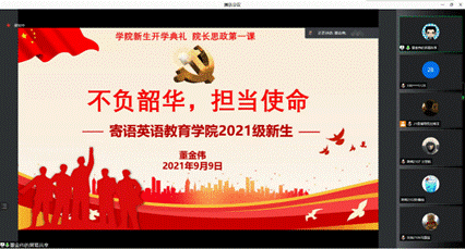2021年9月9日晚,js3333线路检测中心2021级新生开学典礼暨院长思政第一课于腾讯会议线上举行。js3333线路检测中心院长董金伟,院党委书记杨敏生,副院长吴岩、张倩、陈金诗,党委副书记骆银花,党委委员江健,院长助理李惠胤,团委书记刘博洋,辅导员迟殿凤,师范系主任谢剑萍以及2021级全体新生参加了开学典礼。此次典礼由骆银花副书记主持。