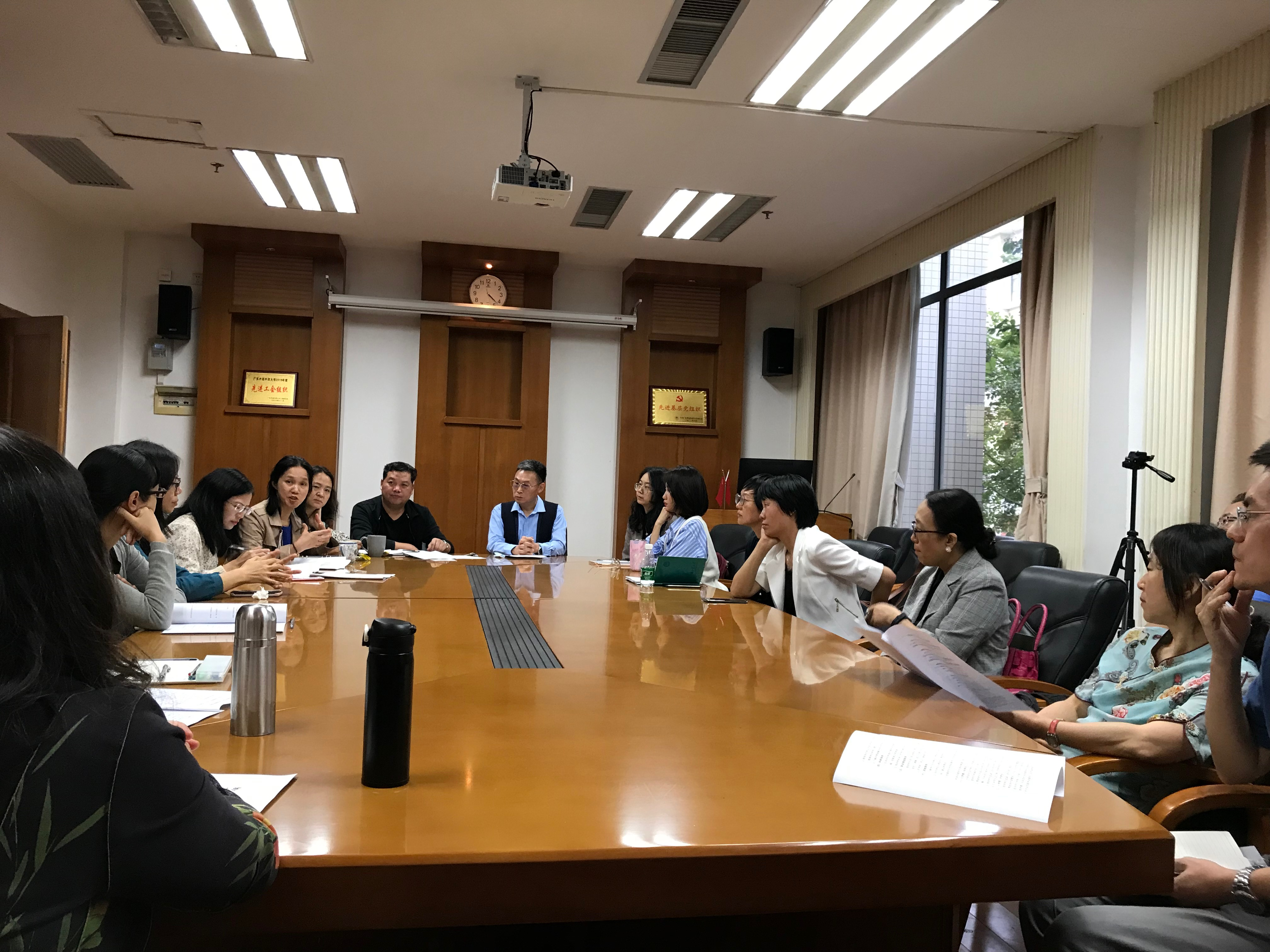 会议的另一主题为本科生导师培训。为保障线路检测中心本科教学全面学分制的有效实施,充分发挥本科生导师的积极作用,全体师范教师在与会领导的指导下,依据《广东外语外贸大学本科生导师制管理办法》,对本科生导师制进行了系统学习和讨论,包括本科生导师制评估指标体系和本科生导师评估问卷项目等议题。