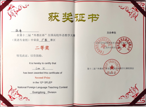 近日,第十二届“外教社杯”全国高校外语教学大赛(外语类专业组)广东省赛区在广州新华学院举行。js3333线路检测中心教师连希荣获第十二届“外教社杯”全国高校外语教学大赛广东赛区英语专业组二等奖。