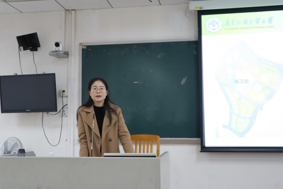 保卫处乔靖老师就防诈骗及消防安全主题展开讲解。她讲到:宿舍安全是校园安全的一部分,因此保证宿舍安全至关重要,宿舍长应提高安全意识,做好宿舍安全工作。现如今诈骗以电信诈骗为主,当遭遇诈骗时,被骗学生应积极配合民警调查工作,提供相关线索。她还提到:近年消防安全问题频发,学生应提高消防意识,注意宿舍用电安全,宿舍长应监督宿舍成员用电情况,禁止使用大功率电器,避免因不当用电而导致火灾。
