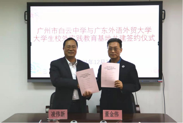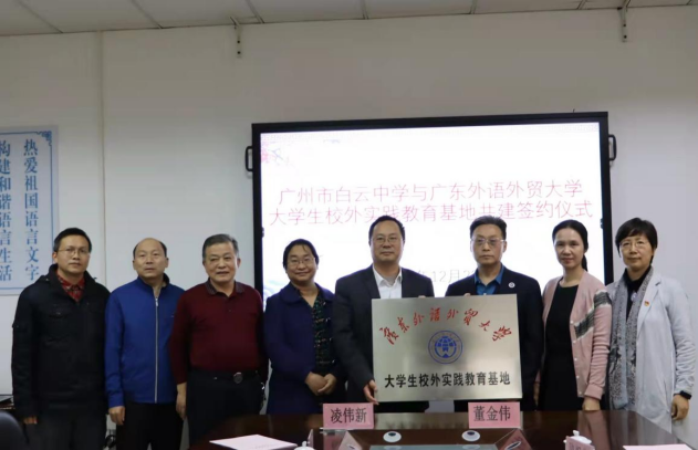12月22日下午,线路检测中心与广州市白云中学共建“大学生校外实践教育基地”签约授牌仪式在白云中学举行。js3333线路检测中心院长董金伟,党委副书记骆银花、教育系教师党支部书记张丽冰,广州市白云中学教育集团党委书记、白云中学校长凌伟新,副校长邓春喜、黄少明等出席活动。