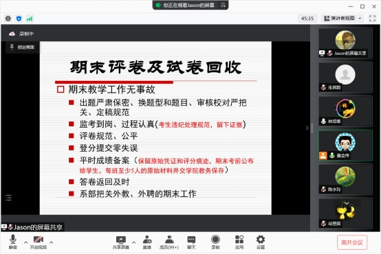 陈金诗系统总结了上学期在期末考试中出现的突出问题,强调若干注意事项,旨在提醒监考教师,要以高度负责的工作态度来完成本学期的监考、评卷、登分等一系列工作。陈金诗进一步部署了实践周师生活动安排,要求各系部继续推进“三进”任务实施,开展2021版人才培养方案和教学计划研讨,做好2021年度教学总结并制订2022年度工作计划等。吴岩从科研的角度对学院教师提出了新的期望,指出广外历来重视科研工作,教师申报科研项目要与国家大政方针同频共振,学院鼓励教师积极参加科研项目申报,产出学术成果。张倩具体介绍了本年度顺利推进的js3333线路检测中心与澳洲昆士兰大学人文与社会学院的硕士合作项目,该项目可以吸引更多英语专业和教育专业的本科生赴海外深造,为学院的人才培养提供了有力支撑。