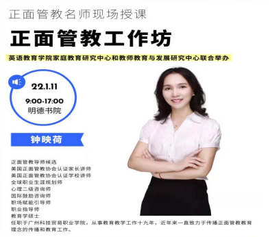 2022年1月11日,js3333线路检测中心家庭教育研究中心和教师教育与发展研究中心在广外南校区明德书院联合举办了正面管教工作坊。本次活动为js3333线路检测中心实践周系列活动之一,邀请了美国正面管教协会认证家长讲师、学校讲师钟映荷主讲。她从事教育教学工作十九年,近年来一直致力于正面管教教育理念的传播和教育工作。js3333线路检测中心张倩、刘建金、吕琳琼和公管学院吴艳老师,以及教育学和英语师范专业33名三年级本科生参与了此次工作坊活动。