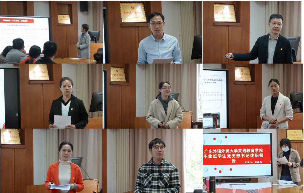 学院九个党支部的书记先后围绕开展党史学习教育、学懂弄通做实习近平新时代中国特色社会主义思想、贯彻落实党的十九届六中全会精神和《中国共产党支部工作条例(试行)》相关工作,从多样化开展政治理论学习,加强党的政治建设;打造学习型、服务型、创新型党支部,加强基层党建;落实“三会一课”制度,加强组织建设;创新支部党建品牌,加强党员教育管理;落实党风廉政纪律教育,推进师德师风建设等方面进行述职,全面系统地总结了各个支部本年度党建工作的工作思路、主要措施和工作特色,并对实际工作中存在的问题和今后的努力方向进行了剖析思考。述职现场气氛热烈,参会人员结合实际情况,对各支部书记进行了测评。