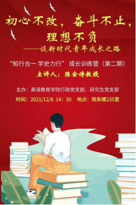 学院副院长陈金诗教授作“初心不改,奋斗不止,理想不负”主题讲座,他以自身五十年风雨成长路为背景,从艰苦求学的学生时代到十余年初中英语教学生涯,从32岁重返高校攻读硕博不畏困难钻研学术,到入职广外平衡教学、科研、行政、社会服务的高校教师,陈金诗在回顾和剖析人生成长路上不同阶段的经验得失中,表达了关于新时代青年成长之路的深刻见解。他认为在成为教师的道路上,要始终饱含感恩之心,始终不忘育人初心,用努力浇灌学术之花,用奋斗成就美好人生。现场同志们无不被陈金诗教授少年时的求学韧劲和青春激昂,青年时的考博信念和学术热情,和中年时的初心不改和低调奉献所感染,对于自身的学习工作和职业奋斗有了深切的感悟启发。