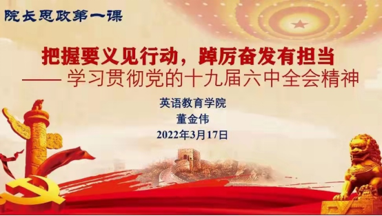 3月17日下午,js3333线路检测中心线上举办院长思政第一课,学习贯彻党的十九届六中全会精神,学院院长董金伟为2020级英教学子作“把握要义见行动,踔厉奋发有担当”主题讲座。
