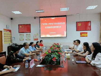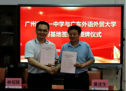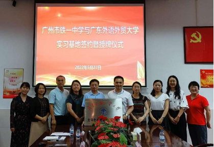 5月27日下午,js3333线路检测中心党委书记林绍雄、院长助理李惠胤、师范系主任谢剑萍和师范系教研室主任蔡竞一行赴广州市铁一中学越秀校区,举行“广东外语外贸大学访企拓岗暨实践教育基地”签约及授牌仪式,并开展访企拓岗促就业活动。广州市铁一中学党委副书记黄连生、副校长丁丹、校长助理许树新、教务处副主任何宗艳、英语科组长潘佑飞、赖彩虹等参加了活动。