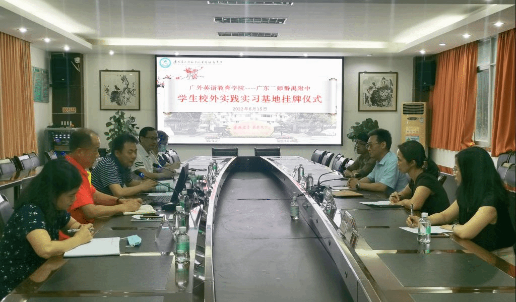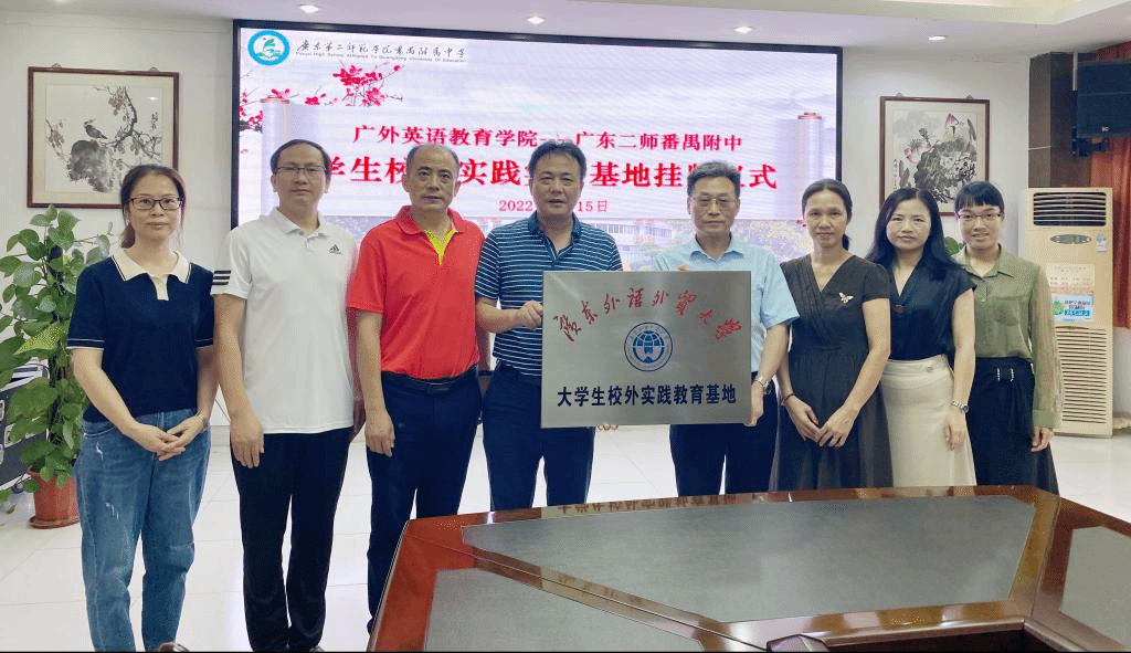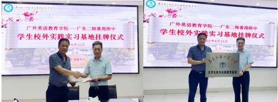 6月15日下午,广外js3333线路检测中心与广东二师附中共建“大学生校外实践教育基地”,并在广东二师附中举行签约挂牌仪式。出席仪式的有js3333线路检测中心院长董金伟、党委副书记骆银花、师范系主任谢剑萍和师范系教师庾小美,广东二师附中校长罗珊瑚、副校长宋文仲、教导处主任罗剑锋、教研室主任刘东明以及英语科组骨干教师凌朝霞。