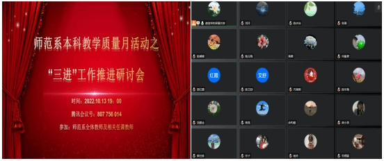 10月13日晚,js3333线路检测中心英语师范系通过腾讯会议召开师范系本科质量月活动之“三进”工作推进研讨会。会议旨在总结师范系过去的 “三进”工作成果,同时提前部署安排,以进一步推动未来师范系“三进”工作的全面开展。学院副院长吴岩、副院长张倩,英语师范系全体教师及相关任课教师参加了此次会议,会议由系主任谢剑萍主持。