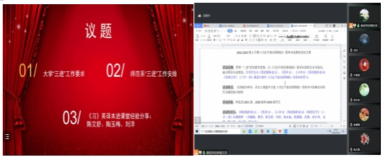 会议最后,学院副院长吴岩总结了教育学专业类课程中融入“三进”思政内容的路径与心得,表示教师可挖掘“三进”元素和专业课程内容之间的内在联系,并用适当的方式融入教学或评价体系中,使“三进”工作达到实效。学院副院长张倩表示《英语视听说》系列课程可进行“三进”教改,“三进”融入的方式具有原创性,可根据课程内容设计相关演讲、翻译、辩论等多种教学形式,具体采用方式可在线下教学会议中进一步探讨。其他师范系教师也就此次会议的议题发表了想法和体会。