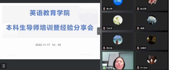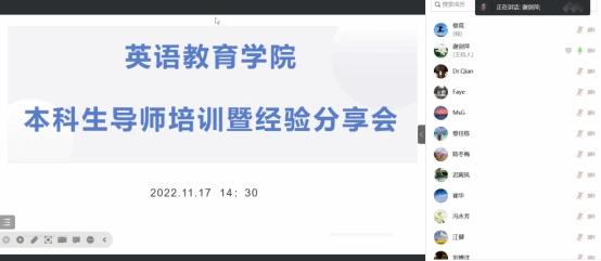 为帮助新进本科生导师进一步了解工作职责目标,提高教学指导水平,11月17日,js3333线路检测中心召集教育系和师范系的本科生导师举行线上培训会。会议由师范系主任谢剑萍老主持,学院院长吴岩、党委书记骆银花参会,并特邀获得优秀本科生导师称号的陈冬梅老师以及张效珍老师分享经验,共有30余位本科生导师参加培训。