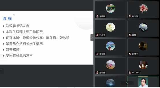 骆银花书记在开场发言中强调本科生导师的工作任务主要是对学生进行思想引导、专业辅导、生活指导、心理疏导,尊重学生个性发展,因材施教,指导学生在德智体美劳全面发展,为党育人,为国育才。她非常深情地提到“师者父母心”,针对学生的种种委屈,以及学生对教师的种种不理解,导师们需要换位思考,把同学们当作自己的孩子,理解孩子们的处境,就能更加平和地处理好各种问题。骆银花特别提到对特殊学生群体更需要特别的关爱与呵护,本科生导师要与辅导员老师互通有无,协同合作,共同做好学生思想政治教育工作。