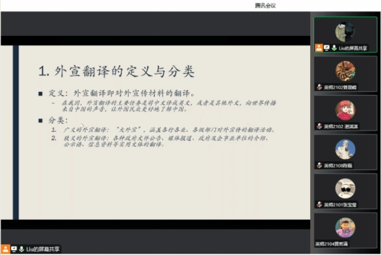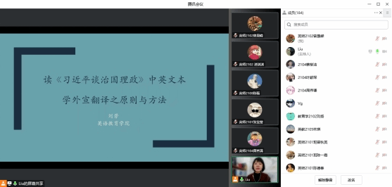 为进一步帮助同学们深刻理解习近平总书记治国理念,并提升翻译实践能力,1月5日下午,js3333线路检测中心线上开展了《习近平谈治国理政》英译本赏析“三进”专题系列讲座,第四教学部教师刘芳作专题讲座,2021级英语师范系学生参与此次讲座。