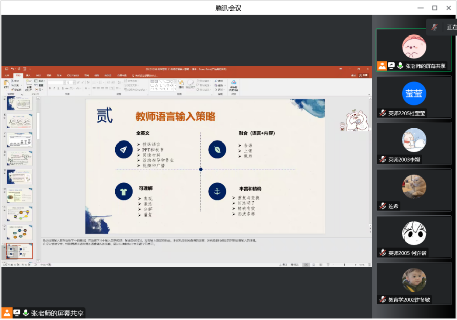4日上午,学院张效珍副教授向2020级学生开展了以“英语浸入式教师课堂语言输入策略”为主题的讲座。张效珍对比了国内外英语浸入式教学的差异,指出国内英语浸入式教学的迫切性。她通过多个优秀教学案例深入浅出地阐释了英语浸入式教学中语言输入的四个策略,强调英语浸入式教学在提升学生人际交往语言和学术语言能力方面的重要作用。