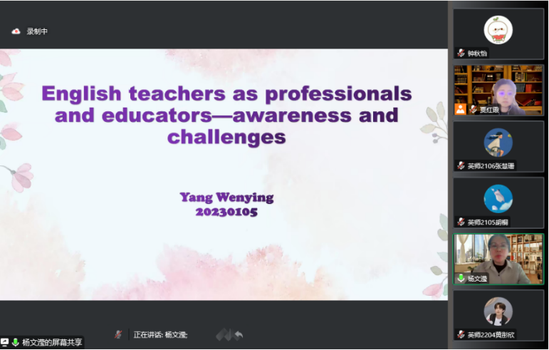 5日上午,广州大学外国语学院杨文滢教授为2021级学生作学术讲座:English Teachers as Professionals and Educators--Awareness and Challenges。杨文滢教授从profession和education的定义和内涵入手,讲解了教育的重要意义与英语学科教育教学的特殊性。她着重讲解英语师范生应确立的一些英语教育理念、目标与方法,强调了“学高为师,身正为范”的为师守则。杨文滢教授鼓励同学们努力学习专业知识,在未来成为一名优秀的人民教师,为祖国教育事业奉献力量。