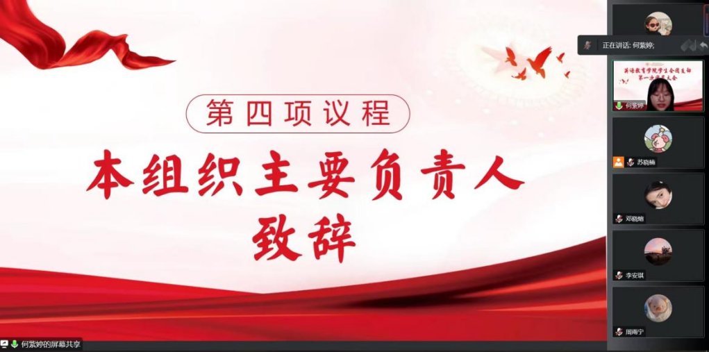 学生会执行主席苏晓楠为本次大会致辞。她对以往工作进行总结汇报,并对支部委员会提出以下要求:一是充分发挥青年先锋队和党的后备军作用,打造学习型团支部队伍,切实提升组织引领、服务青年的能力;二是坚持守正创新,开展有益于青年发展的特色活动;三是切实关注青年的需要,密切联系青年群众,秉承奉献精神,增强服务意识,真正做到为同学服务。