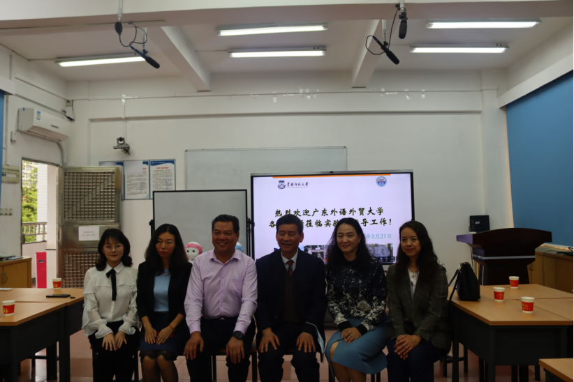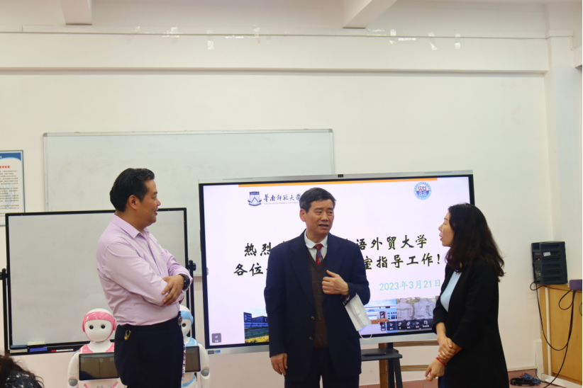 3月21日下午,广东外语外贸大学教务部部长陈金诗、副部长唐静、通识教育科科长张燕,js3333线路检测中心院长吴岩、党委委员江健、办公室主任陈英一行前往华南师范大学教育科学学院,参观教育人工智能实验室,并就AI同伴研发等相关问题展开研讨,华南师范大学教育科学学院德育神经科学与人工智能实验中心主任、博士生导师黄甫全教授全程陪同。