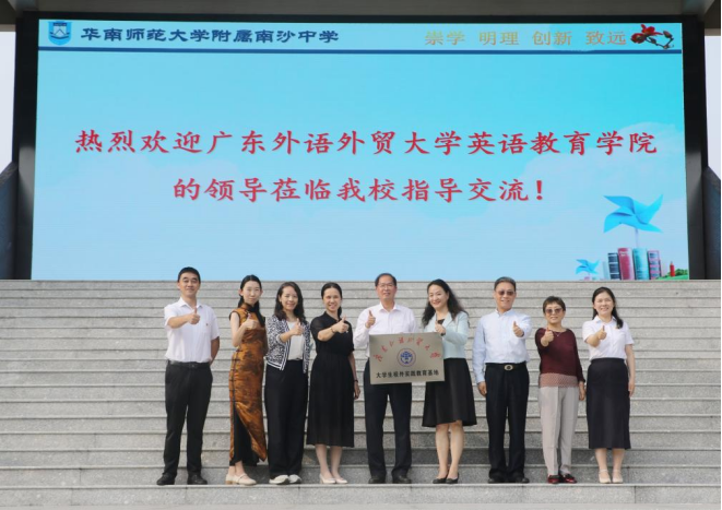 2023年5月15日下午,广东外语外贸大学大学生校外实践教育基地签约仪式暨招生宣传活动在华南师范大学附属南沙中学举行。教育学院院长吴岩教授、党委书记骆银花、原教育学院院长董金伟教授、学院党委委员江健、教育系张效珍副教授、办公室主任张文萃等一行出席此次活动。