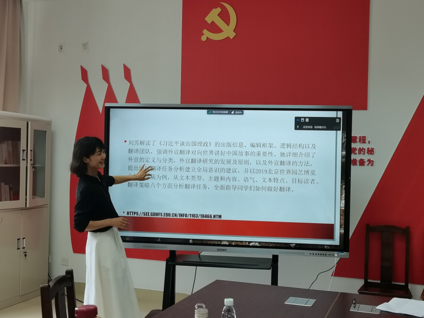 刘芳老师代表第四教学部将翻译组于2021年12月至2022年6月和2022年9月至12月进行的“三进”专项翻译培训系列讲座向全体参会教师做了细致的示范,展示了翻译组的老师是如何带领学生对《习近平谈治国理政》英译本进行赏析,从而使学生们更透彻地理解习近平新时代中国特色社会主义思想,成为思想坚定、视野开阔的外语人才;更深入地了解翻译理论和技巧,学会如何准确传播中国声音、讲好中国故事、展现中国智慧。