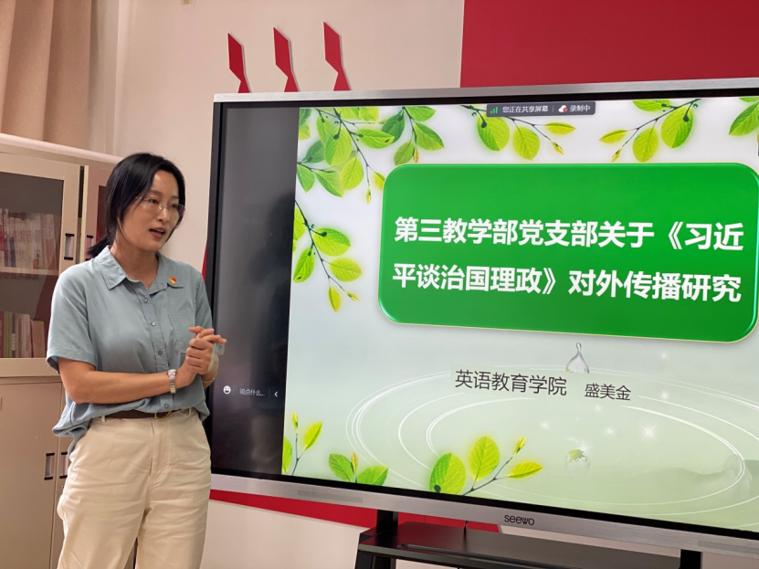 盛美金老师代表第三教学部总结“第四批全省党建工作样板支部”培育单位第三教学部党支部近两年关于《习近平谈治国理政》对外传播研究,具体向老师们展示了《习近平谈治国理政》对外传播研究如何在视听说课程的实操中落地。介绍了2021年至2022年期间,陶玉梅、江健、盛美金、刘梦莲等老师先后为教育系和师范系学生开展了8场“三进”系列讲座,马小宇,陶玉梅,盛美金三位老师制作的校级思政教学案例,以及贯穿《新闻英语听说辩》与《高级影视英语》每一课每一个单元的思政主题延伸。