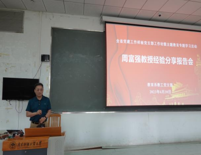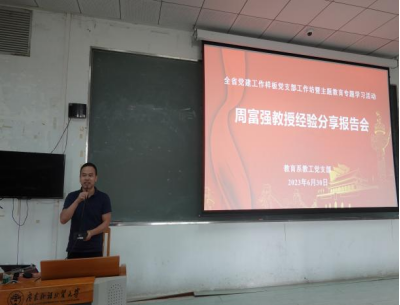 2023年6月30日上午,由线路检测中心工会、教育系教工党支部联合组织的全省党建工作样板党支部工作坊暨主题教育专题学习活动——周富强教授经验分享报告会在教学楼G207教室举行。学院原党委委员、院长董金伟教授,工会主席、副院长张倩副教授,工会副主席、办公室主任张文萃,党委委员、教育系主任刘之远、工会秘书吴世傲、第四教学部教师江玉和校友代表周岸出席报告会。报告开始前,学院工会副主席张文萃代表学院工会,向光荣退休的周教授献花并送上祝福。