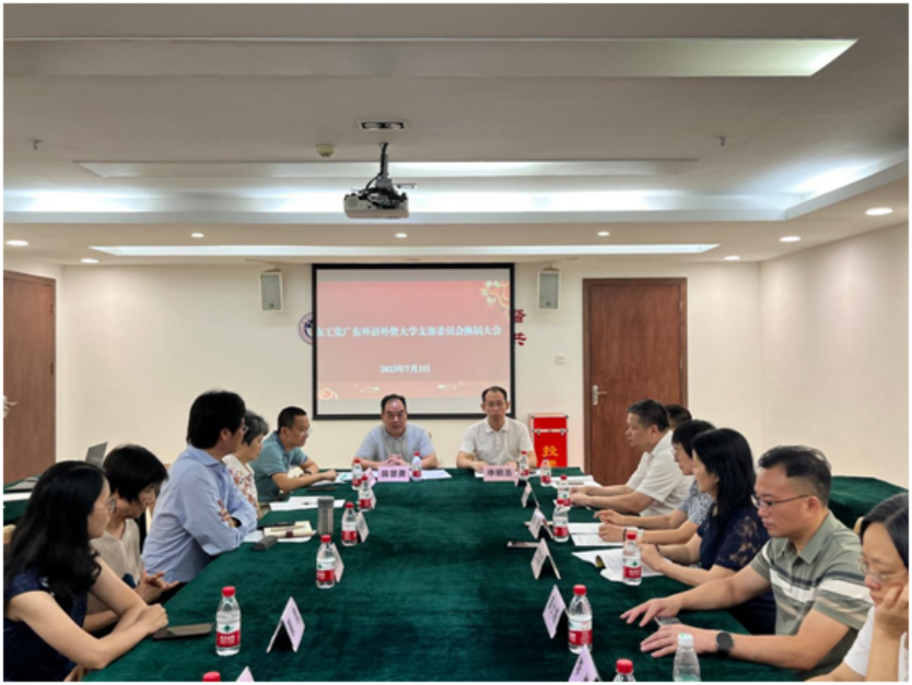 7月3日,中国农工民主党(简称农工党)广东外语外贸大学支部委员会换届大会在我校统战办公室举行。农工党广东省委会专职副主委陈景勇,我校党委常委、副校长申明浩出席会议,校党委统战部副部长林宏伟、农工党广东省委会组织处负责人冒亚军、农工党广东省委会组织处调研员黄素勤、农工党广东省委会参政议政处主任科员、广外支部联络员张怡、线路检测中心副院长张倩及校农工党支部十余名党员参加会议。